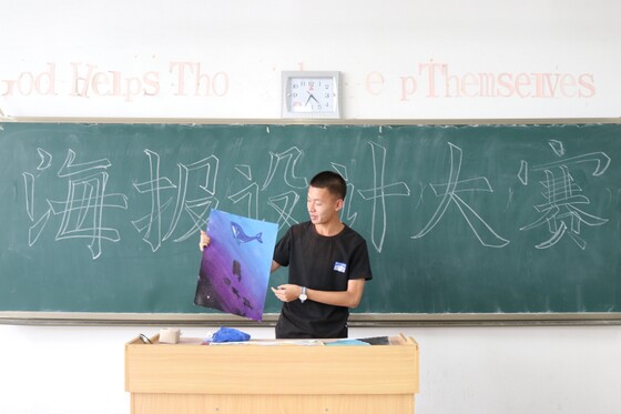 首先,比赛评委入场,主持人宣读比赛流程。赛程分为两步,第一轮次,每位参赛选手展示自己创作的海报,并陈述设计理念;第二轮次,评委对每幅作品进行点评,并最终讨论选取满意的作品。