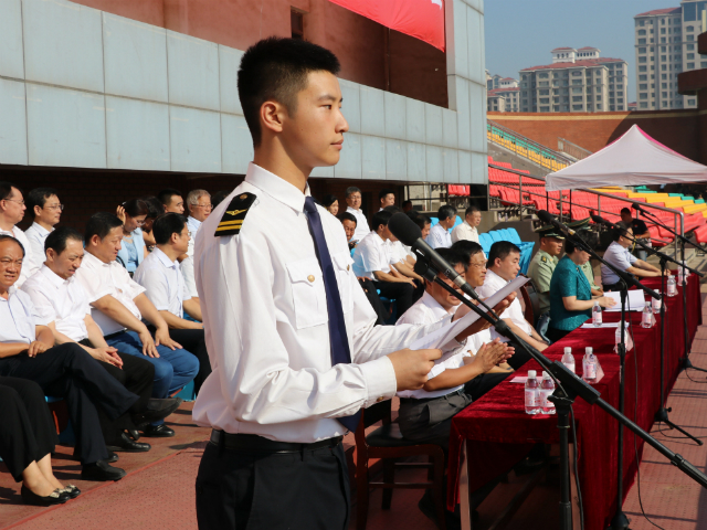 李长海代表学校党委、行政和全校师生,对2019级新同学表示衷心祝贺和热烈欢迎。他说,4000余名新同学的到来为聚英湖畔注入了新时代的青春活力,为陶园学林增添了新青年的靓丽色彩。他指出,滨州学院是一所历史底蕴深厚、师资力量雄厚、航空特色鲜明、就业前景远大的大学,希望同学们志存高远、砥砺奋进,做“自强”的滨院人,在拼搏的青春中成就美好华章;勤学善思、持之以恒,做“自律”的滨院人,严格行为习惯,在宝贵有限的大学时光里将人生的基石打牢、打深、打实;与人为善、明德明礼,做“厚道”的滨院人,以美好德行点亮璀璨青春;开拓进取、勇于超越,做“创新”的滨院人,为了追求真理、真知、真学问而孜孜不倦、勇往直前,追求卓越、练就“硬核”,完成由成人向成才的华丽转身,奋力开启绚烂多姿的人生华章。他勉励同学们在接下来的军训中不怕苦,不怕难,服从指挥,听从命令,上好开学第一课。