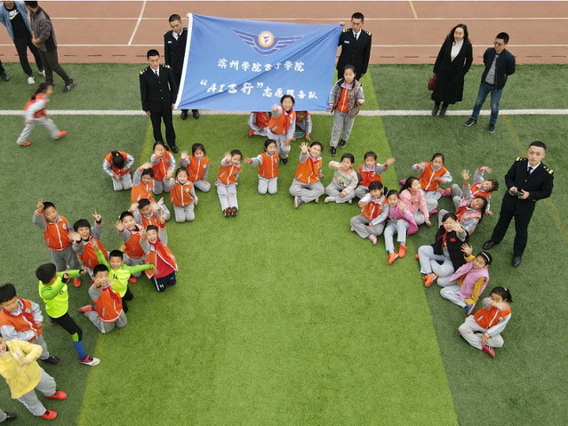 身着正装的志愿者们来到滨州实验学校南校区会议室开展“小小飞行员公益课堂”活动。活动中,志愿者们从航空器的起源开始,向小朋友们介绍了航空器的发展情况,依托专业所学知识,着重讲解了民用航空器以及无人机的发展史,在互动环节,志愿者们在操场进行“AI飞行”无人机表演,通过协助教学、试飞体验等游戏让小朋友们亲身体验飞行的乐趣和技巧。许多小朋友在体验完无人机飞行后激动的表示:要努力学习,争取当一名帅气的飞行员,翱翔祖国的蓝天。
