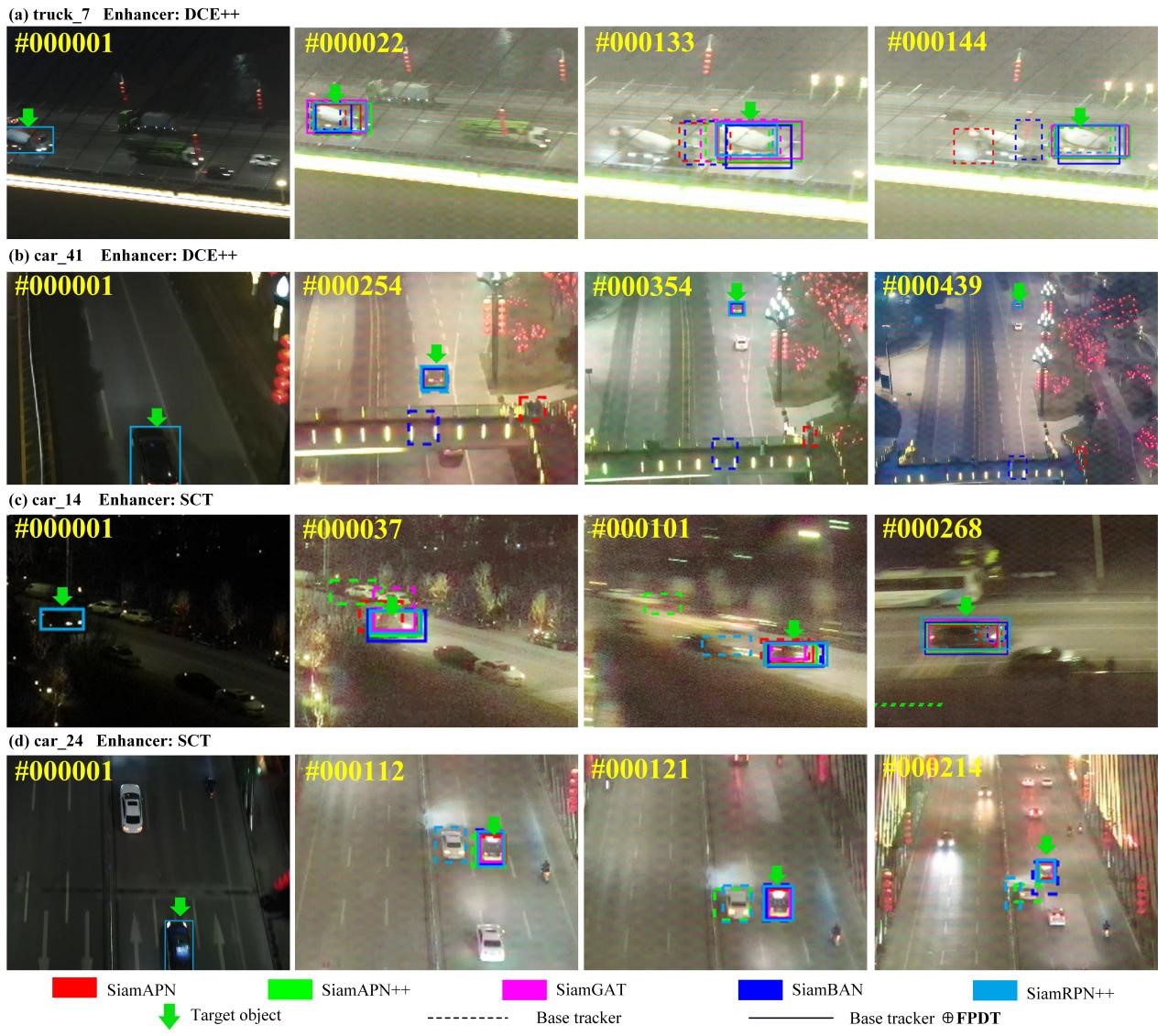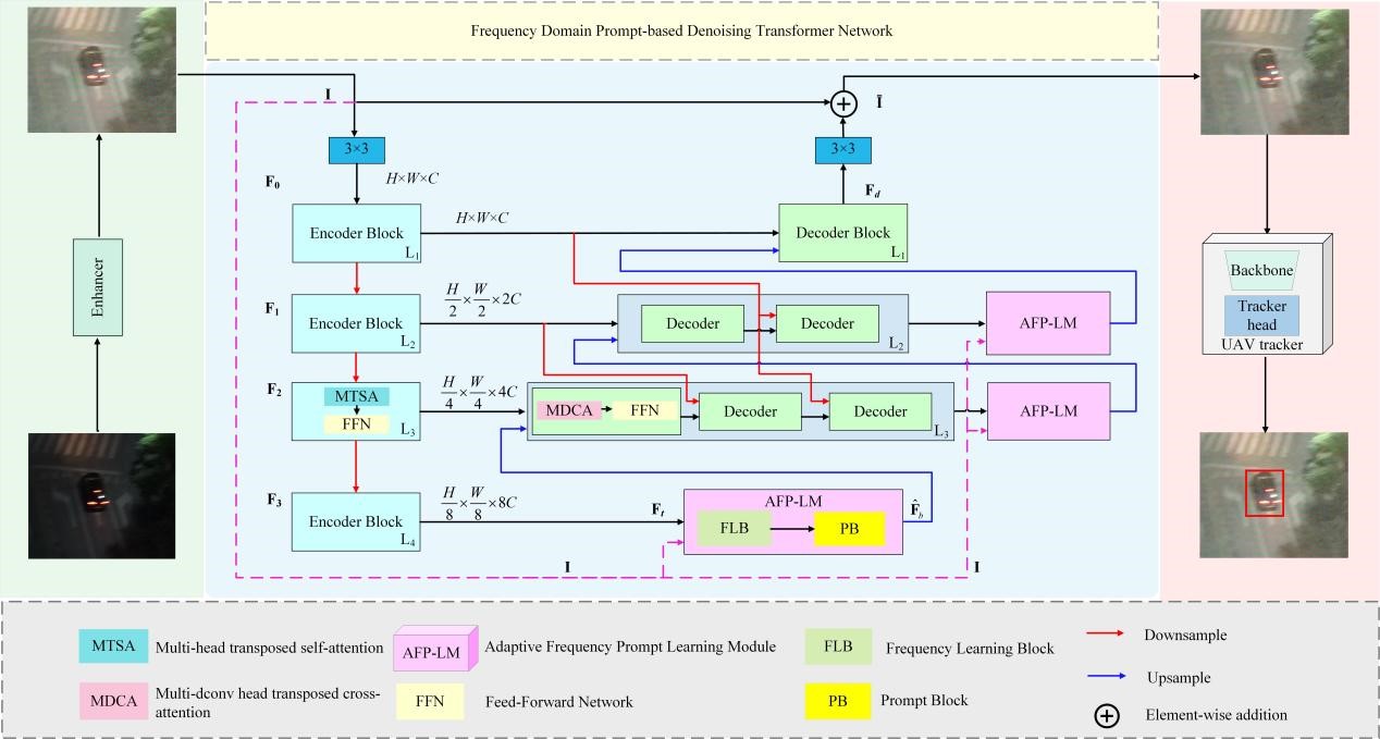 针对在低光条件下无人机跟踪性能受限于机载摄像头硬件,以及复杂环境下普遍存在的噪声与模糊问题,本研究提出基于频域提示的降噪Transformer网络(FPDT)。具体而言,设计了一个轻量级自适应频率提示学习模块(AFP-LM),其中FLB通过频域分析实现高频与低频特征的自适应分离与交互;PB则动态生成频率提示,引导模型抑制高频噪声,从而提升跟踪器的特征提取能力。为进一步强化跨域特征表示,引入双向交叉融合模块(BCFM),实现频域与空间域信息的双向交互。此外,解码器中集成的多卷积头转置交叉注意力机制(MDCA)可促进多尺度特征交叉融合。结果表明,FPDT在多个无人机夜间跟踪基准测试中均取得优异性能,为真实场景下无人机夜间跟踪的应用开发提供了有力的技术支撑。